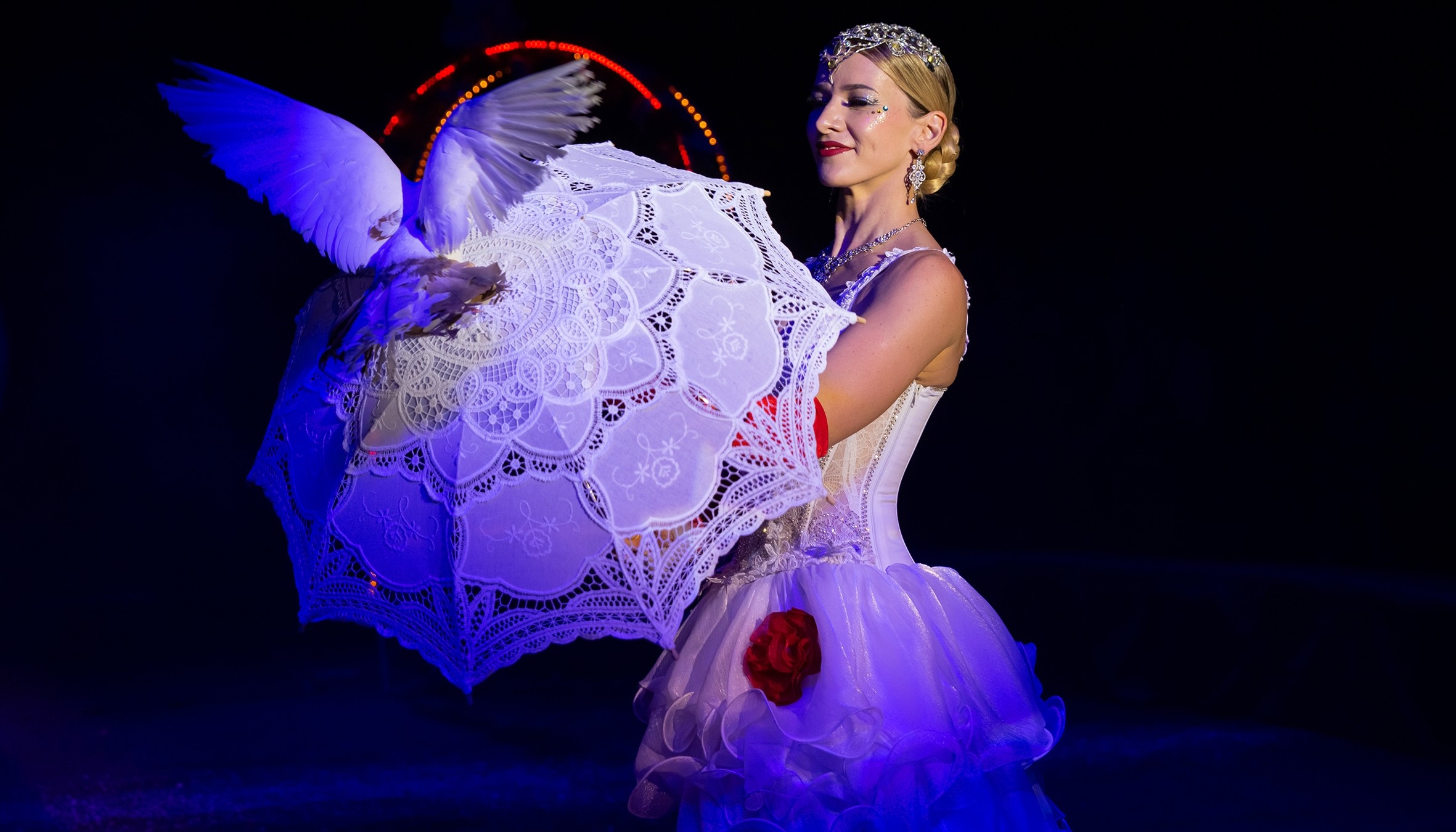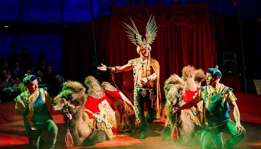 - Большая группа дрессированных животных: форсаж аравийских верблюдов, хорьки-фокусники, дикобраз, голуби, озорные мопсы;